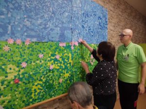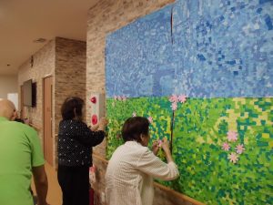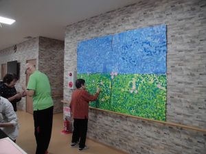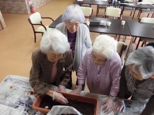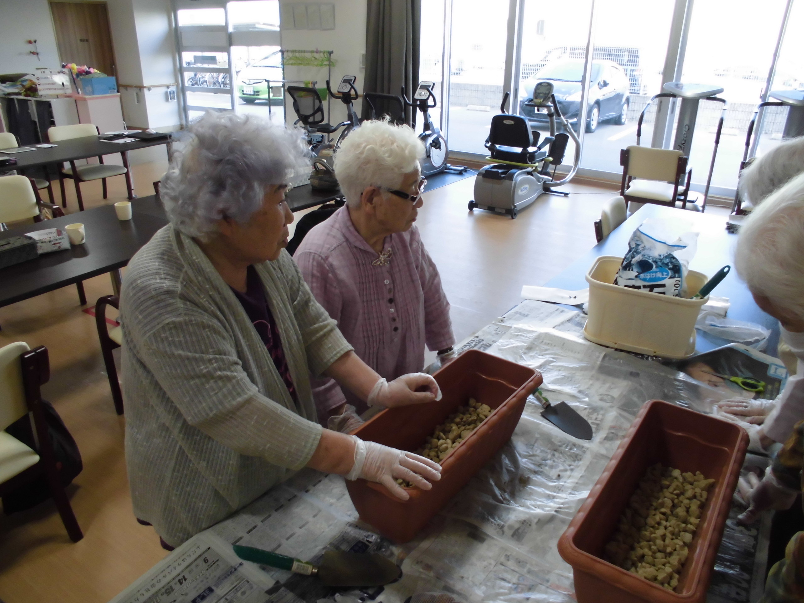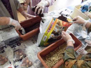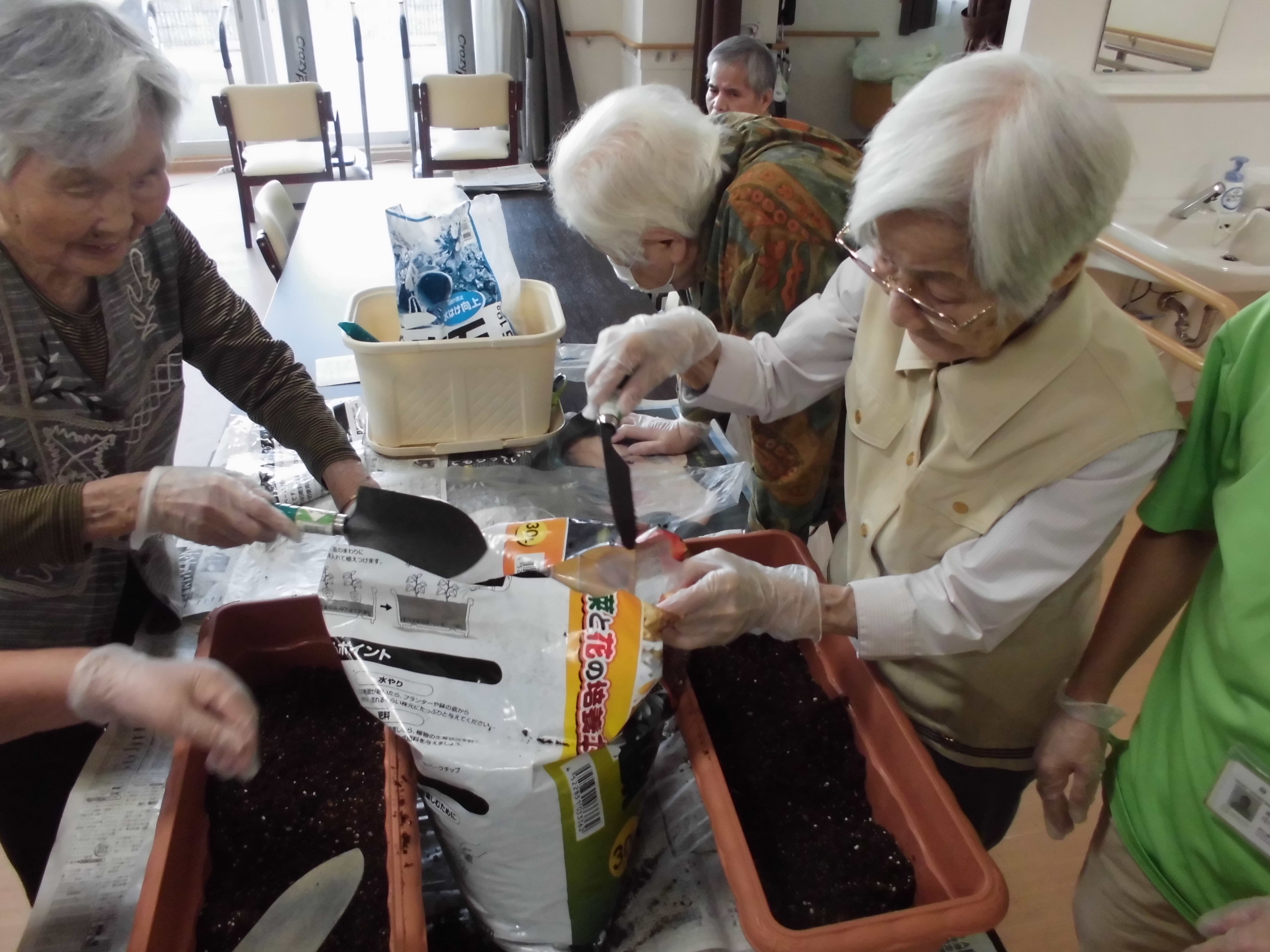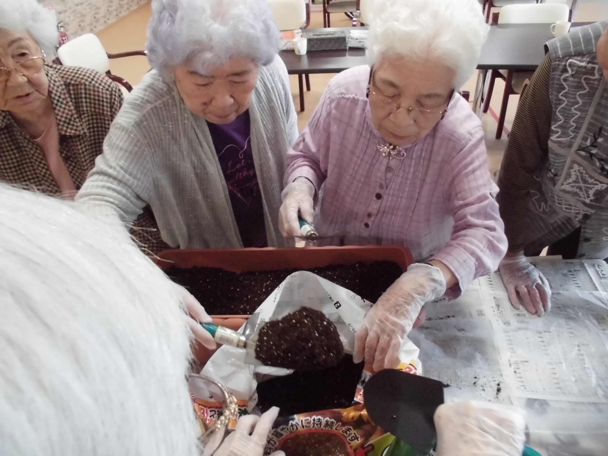 仲良く相談しながら培養土を敷いておられます!