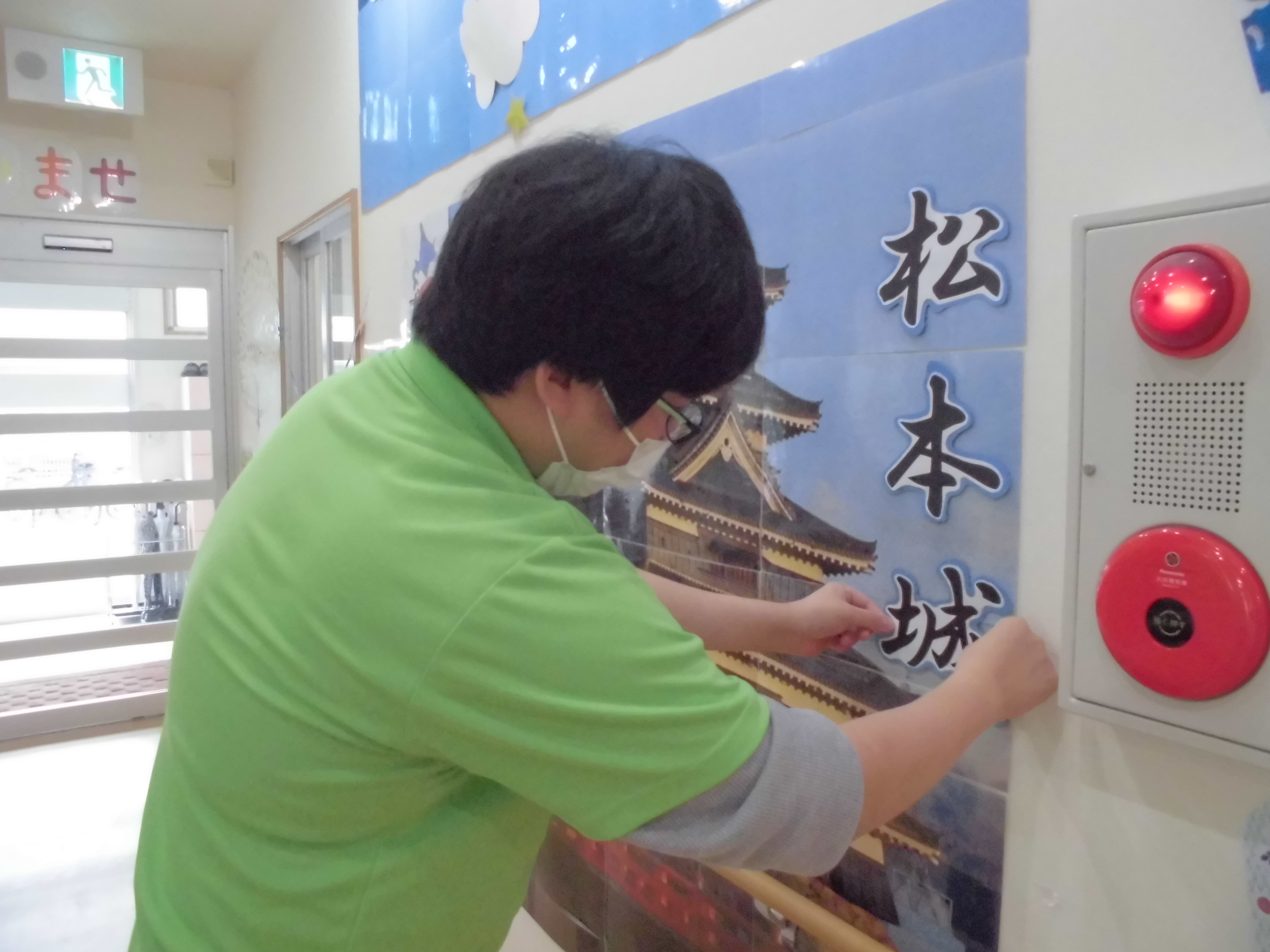 玄関前のお城をレク委員のFスタッフが
