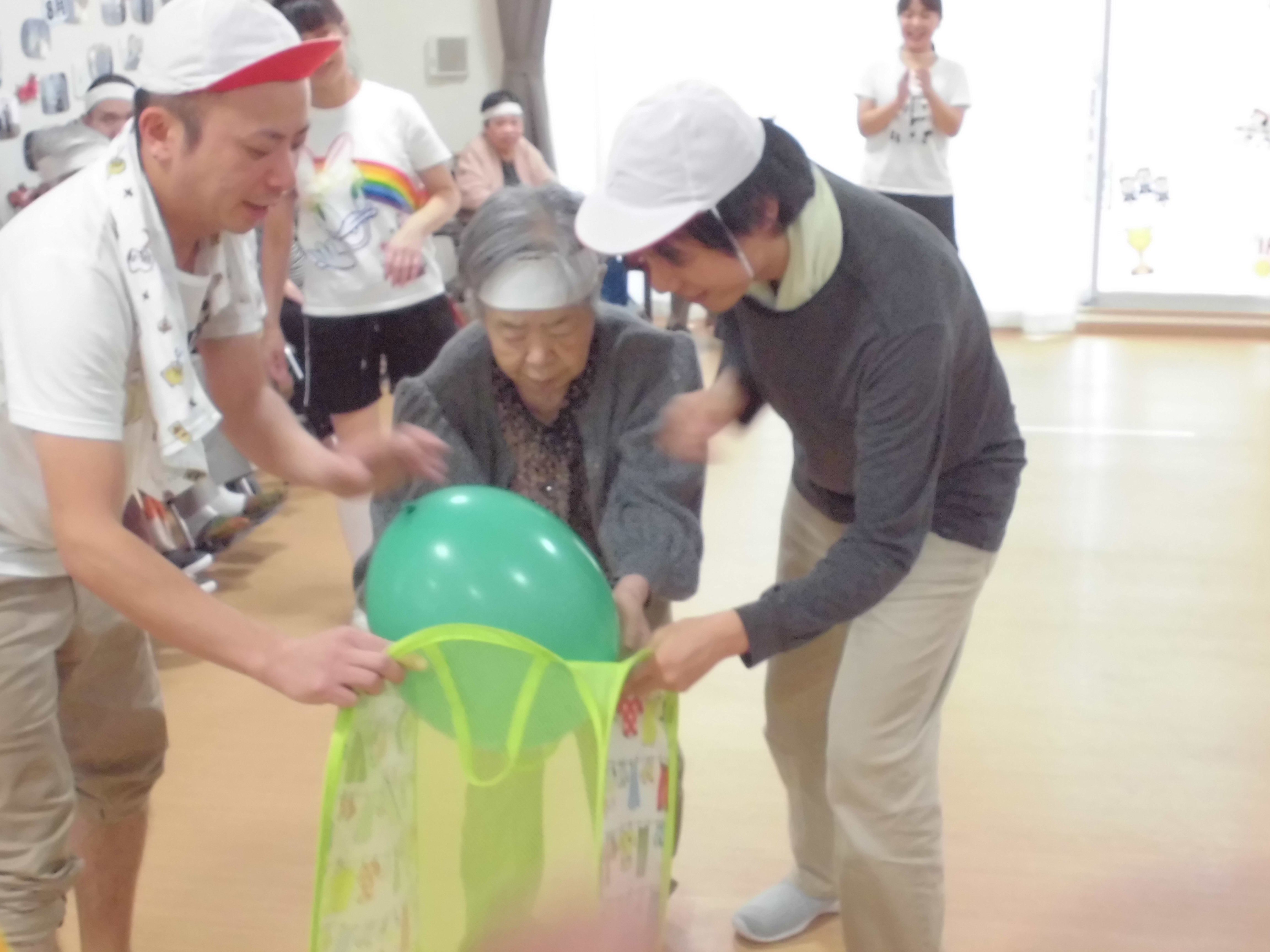 紅組は赤い風船、白組は緑色の風船です。