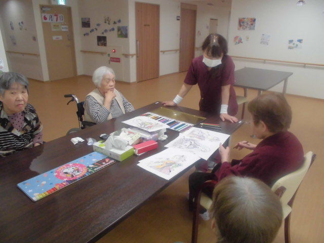 2階の食堂フロアでぬりえを