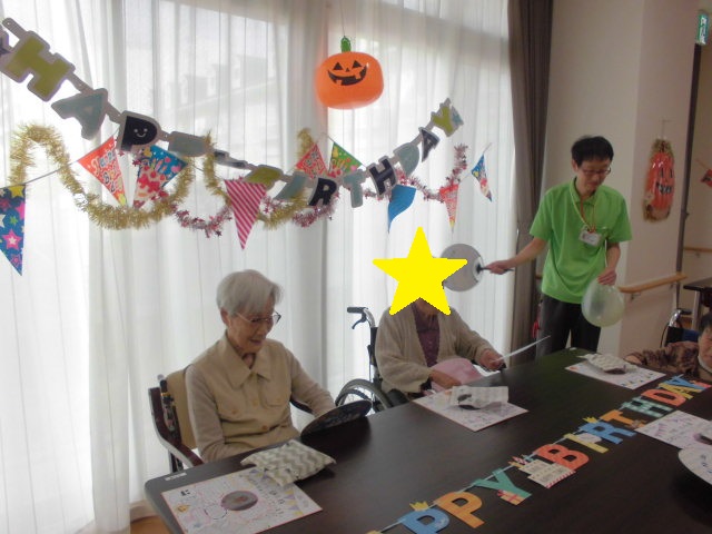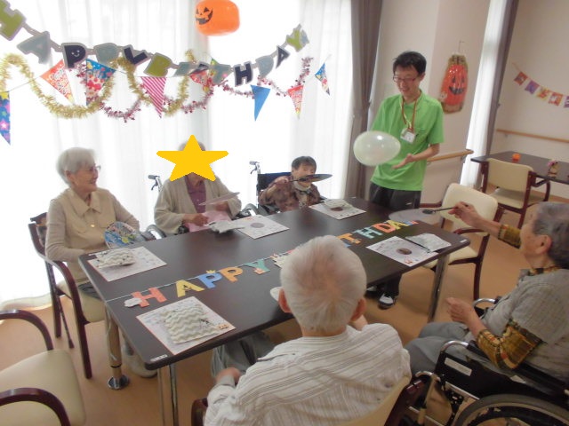 誕生日レクリエーションです。皆様盛り上がっています。盛り上がりすぎて机に乗り出す入居者様もいらっしゃいます(^_-)-☆ 元気でまた一年頑張っていきましょう(^_-)-☆